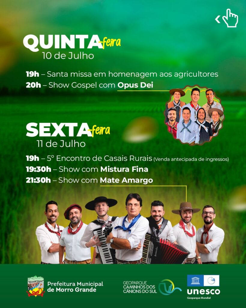 Na sexta-feira (11), segundo dia de festa, a partir das 19hs acontece o 5º Encontro de Casais Rurais (venda antecipada de ingressos – esgotados), as 19:30hs show com Mistura Fina e as 21:30hs show com Mate Amargo.
