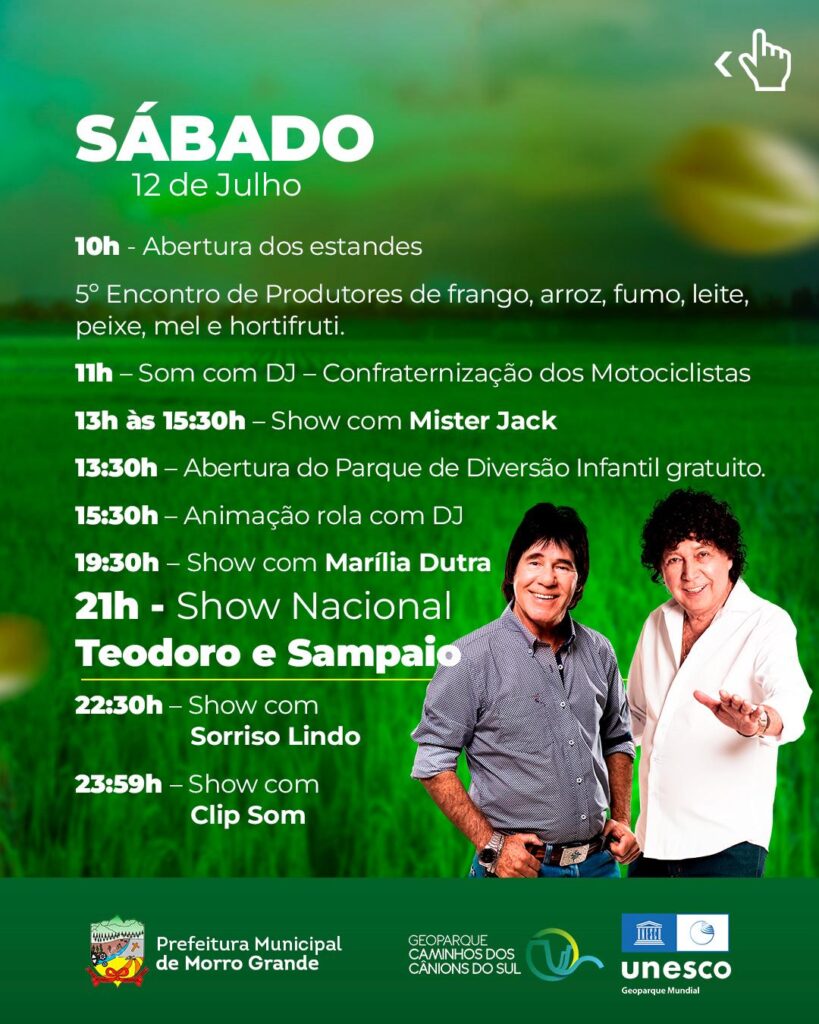 Município se prepara para uma das maiores festas já realizadas. Show nacional gratuito com Teodoro e Sampaio, desfile de máquinas agrícolas, caminhões e carretas alegóricas, gincana, encontro de motociclistas, encontro de casais rurais, estandes e muitas atrações aguardam você em uma das festas mais esperadas da região Sul de Santa Catarina.