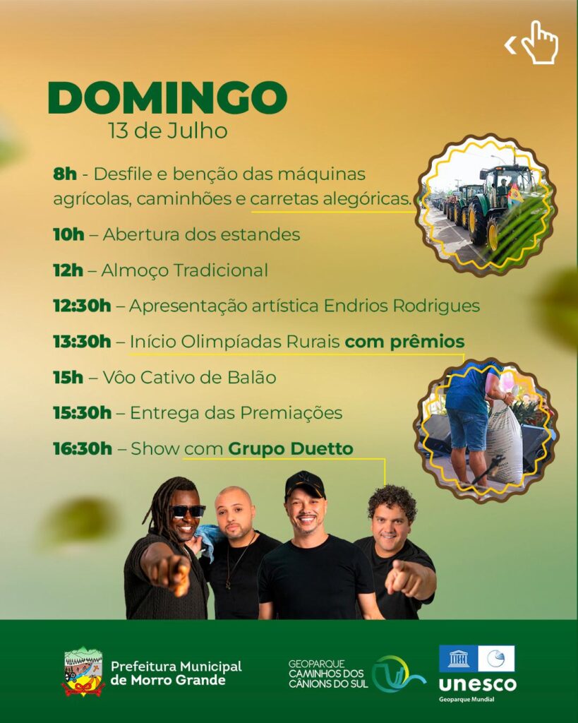 No domingo (13), as 8hs o tradicional desfile e benção das máquinas agrícolas, caminhões e carretas alegóricas movimentará as ruas do município (rotula da ponte, a segunda ao entrar em Morro Grande). As 12hs almoço tradicional, as 12:30hs apresentação artística de Endrios Rodrigues, as 13:30hs início das olimpíadas rurais com premiações, as 15hs voo cativo de balão, as 15:30hs entrega das premiações e as 16:30hs encerramento com o show do Grupo Duetto.