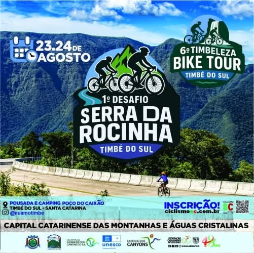 Nos dias 23 e 24 de agosto acontecerá em Timbé do Sul o 1º Desafio da Serra da Rocinha e o 6º Timbeleza BikeTour.