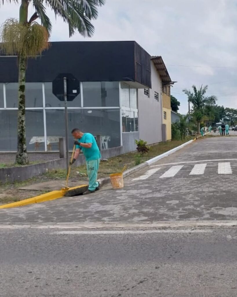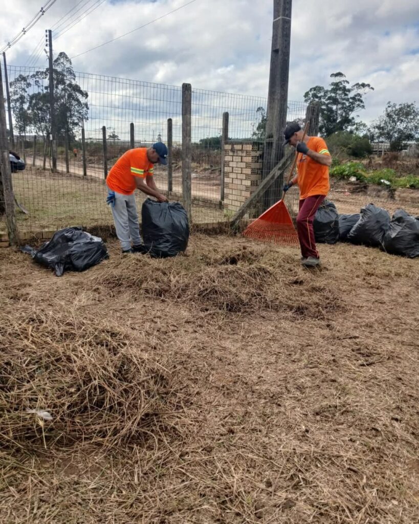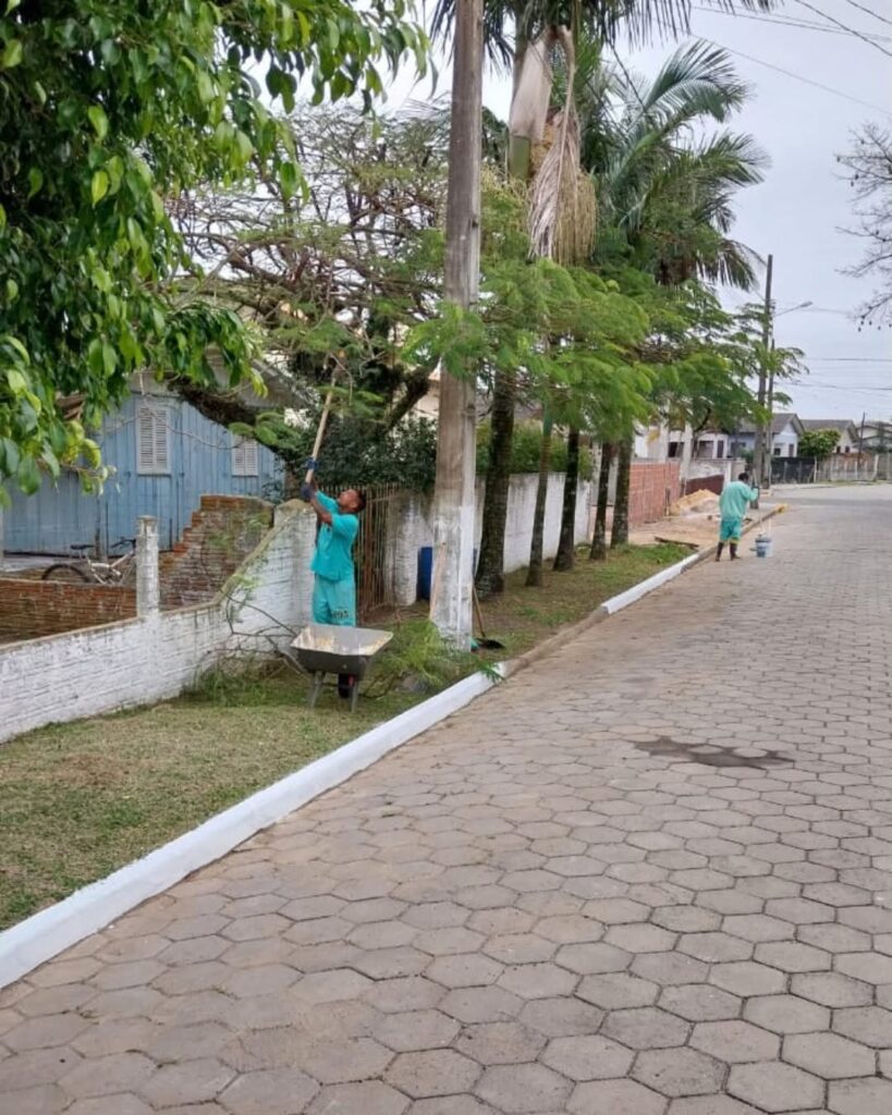 Limpeza no bairro Sanga da Areia: No entorno da Igreja São Cristóvão, foram realizados serviços de capinação, limpeza e pintura de meio-fio, corte de grama, poda de árvores, limpeza de bocas de lobo com remoção de resíduos, além da substituição de tampas danificadas. As ações também foram concluídas nas ruas Manoel João Bitencourt, Eládio Manoel Teixeira e Antônio Marques Zeferino.