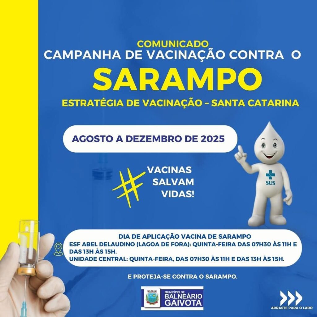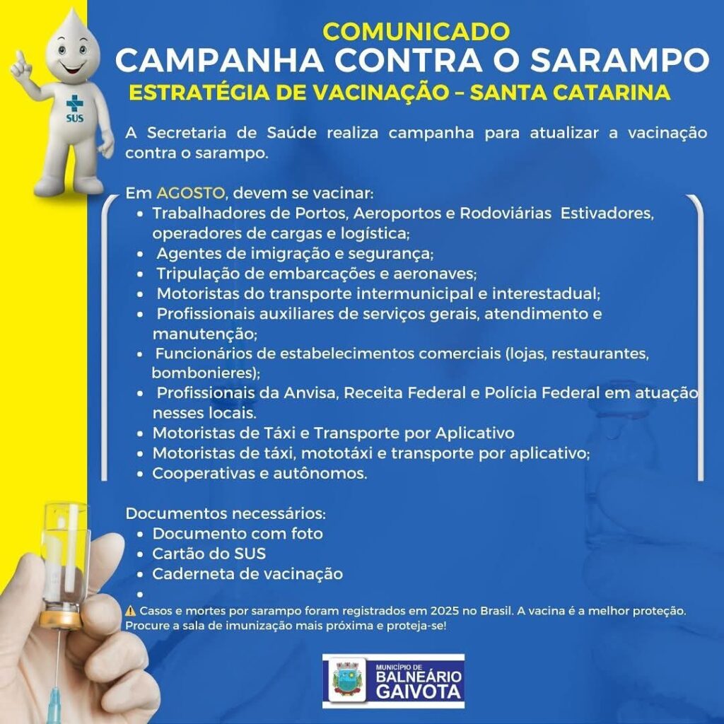 A Secretaria Municipal de Saúde de Balneário Gaivota informa que, entre agosto e dezembro de 2025, estará em andamento a Campanha de Busca Ativa contra o Sarampo, conforme estratégia definida pelo Estado de Santa Catarina.