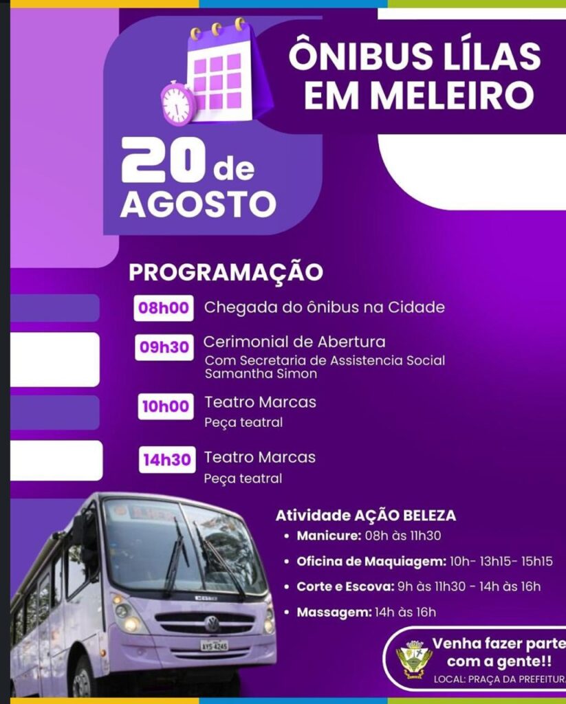 No dia 20 de agosto, Meleiro será ponto de parada do Ônibus Lilás, iniciativa que integra as ações do Mês de Conscientização pelo Fim da Violência contra a Mulher. O evento, promovido com apoio da Secretaria Municipal de Assistência Social, oferecerá uma programação diversificada com atividades informativas, culturais e de cuidado pessoal, voltadas à comunidade em geral.